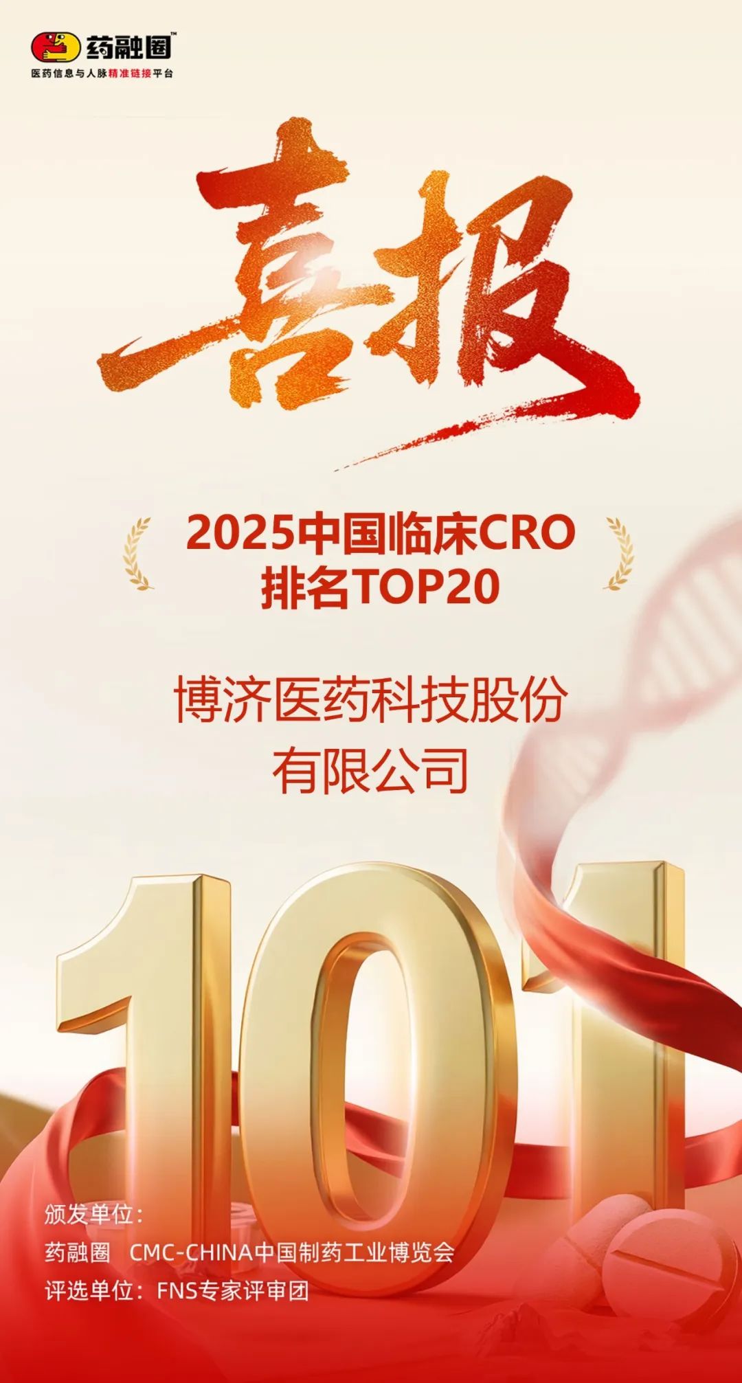 会议期间,备受业界瞩目的《中国临床CRO排名TOP20》重磅发布,博济医药荣膺“2025中国临床CRO排名TOP20”奖项,彰显公司在行业中的领先地位以及创新能力。